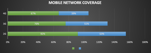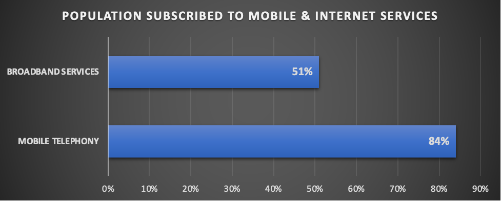 Nation-wide availability of telecommunications networks is enabling widespread adoption of mobile telephony (84%) and broadband communication technologies (46%).
