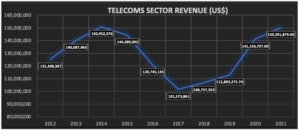 Investment in telecommunications infrastructure and services is generating significant value for operators as critical services go digital and most citizens rely on network services to carry out basic and important services. Following years of aggressive decline in sector revenue, competition-driven measures implemented by LTA saw a gradual and consistent improvement in revenue performance. Since 2017, the sector has experienced a year-on-year growth rate of 11%, restoring sector revenue to over 150 million by 2021.