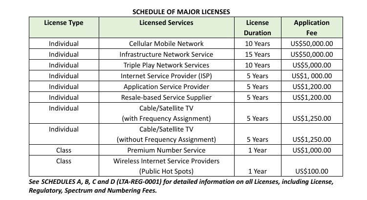 • Class License: is a license issued for a duration of one (1) year to provide telecommunications/ICT services as specified in Schedules A and B (LTA-REG-0001).
